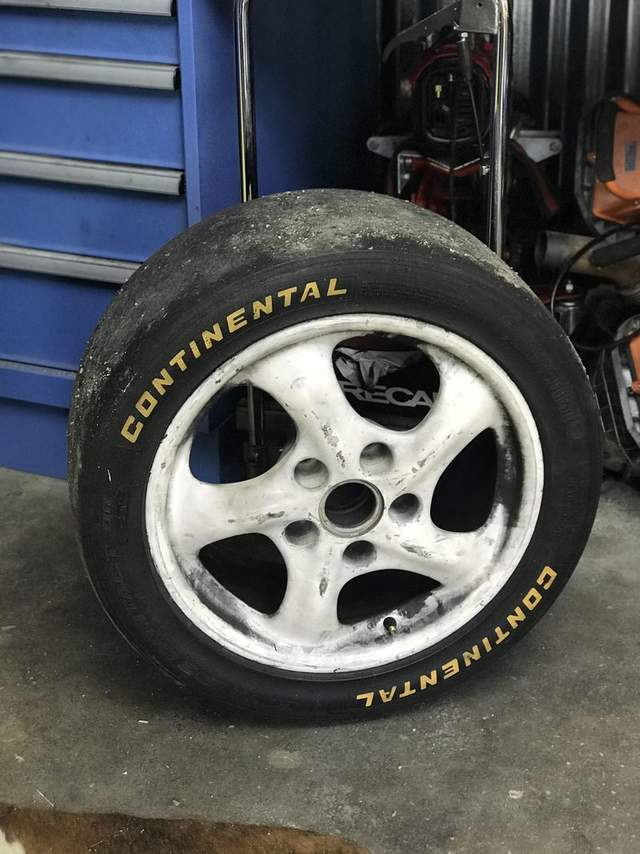 -Four rear wheels with continental racing series slicks (Rebranded Hoosiers). 5 events, plenty of life left. 235 series tires (close to a 255 street tire in width)- $500
