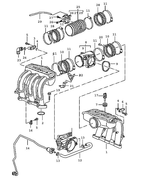 You're close the part that I am referring too that is the "rubber sleeve" are 28 and 10 where in my car there are swapped places and a hose runs from the fuel pressure regulator to 10 where that plug looks like it is going in the photo. That's why I am confused, for my car 10 and 28 are swapped and couldn't be like the picture because the tube isn't long enough to reach anywhere else... does anyone have or know where I can see a picture of a 2001 base engine? I looked on wayne's pages on pelican and get see a clear picture of a 2001 boxster but the ones I do see look similar to my current setup... very frustrating as I am suppose to go out of town in 3 days and am suppose to be driving :troll: