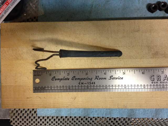 It's about 5 inches in total length and has 2 wire hook-like things at one end and a long metal part about the diameter of a pencil about 3 inches long at the other end.