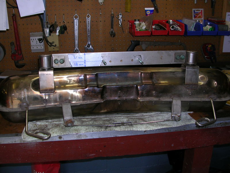 I am ready to hang my new (used) Dansk sausage muffler, and I have noticed that the horizontal hanging bracket has offset holes for the main support bolts. I did not catch this subtle difference during disassembly, and so I now have a 50/50 chance of putting it wrong side up since this horizontal bracket can be fitted either way round.