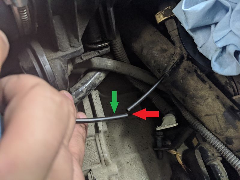 Ive reviewed the diagrams, but I cant follow one of the lines (green arrow) unless I remove the intake manifolds.