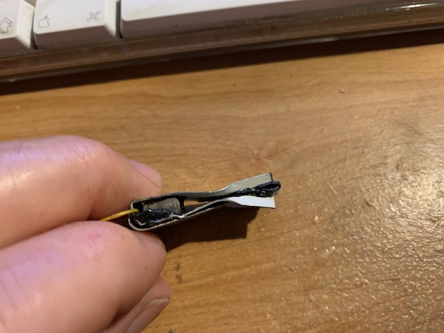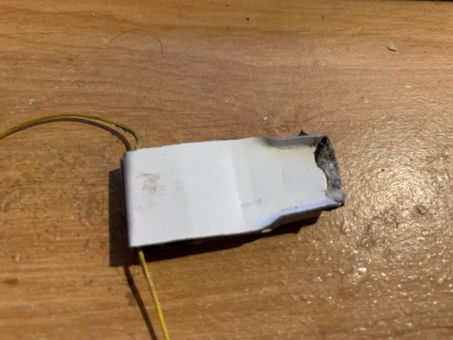 I used a rectangle of steel a about 5mm thick, 17 mm wide and 10 mm long. Then I used thin aluminum to form the wedge which is about 38 mm long. On the thin end of the wedge I bent the aluminum up like little wings to prevent the jaws of the puller from sliding off the wedge laterally. And don't forget the string which is the most important part!