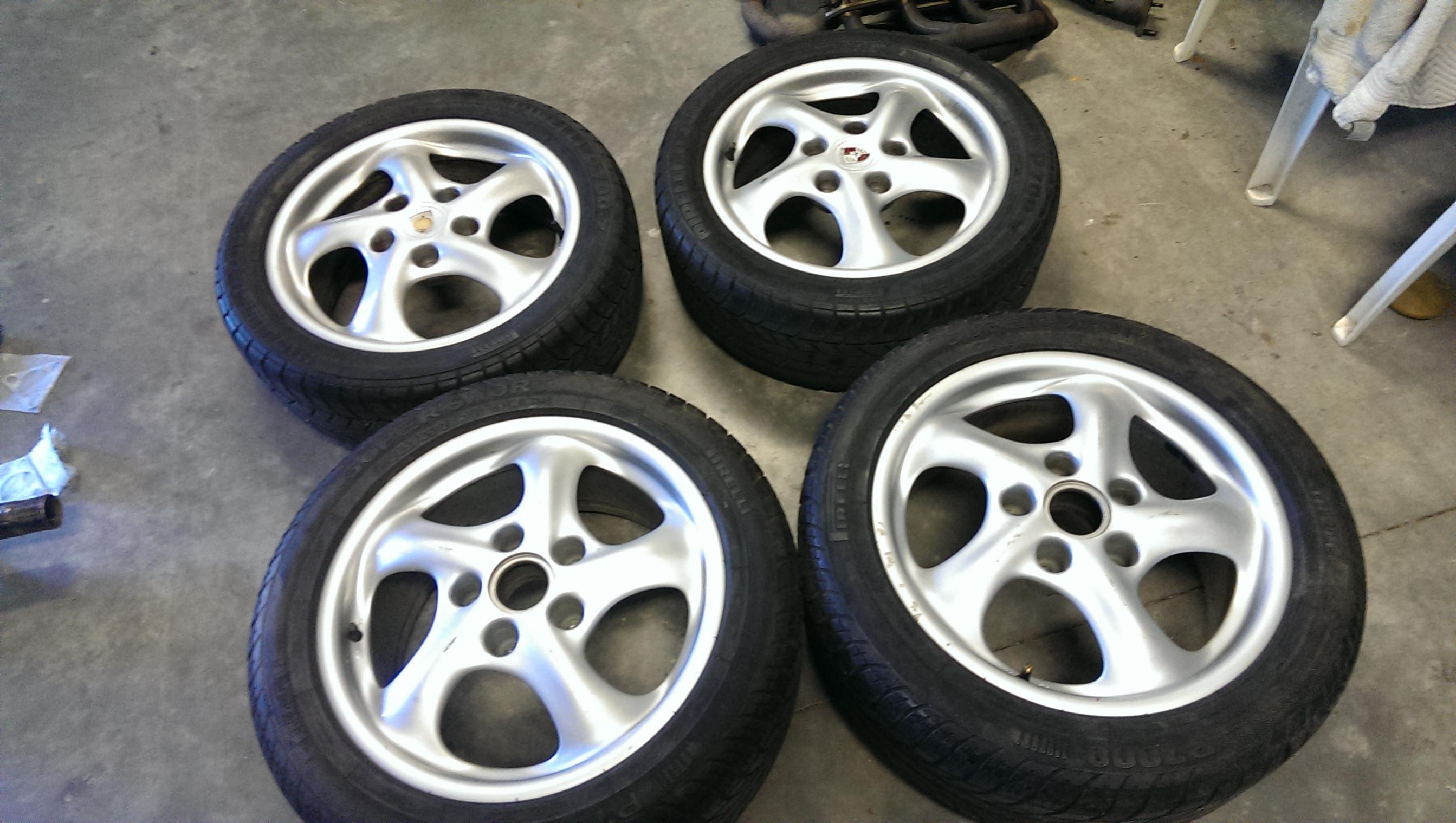 Set of 17 in wheels of a Boxster with approximately 40k. Overall in good condition with some curb rash / scratches. Two of the tires have some life left but the others are toast. Tires can be removed to save on shipping.