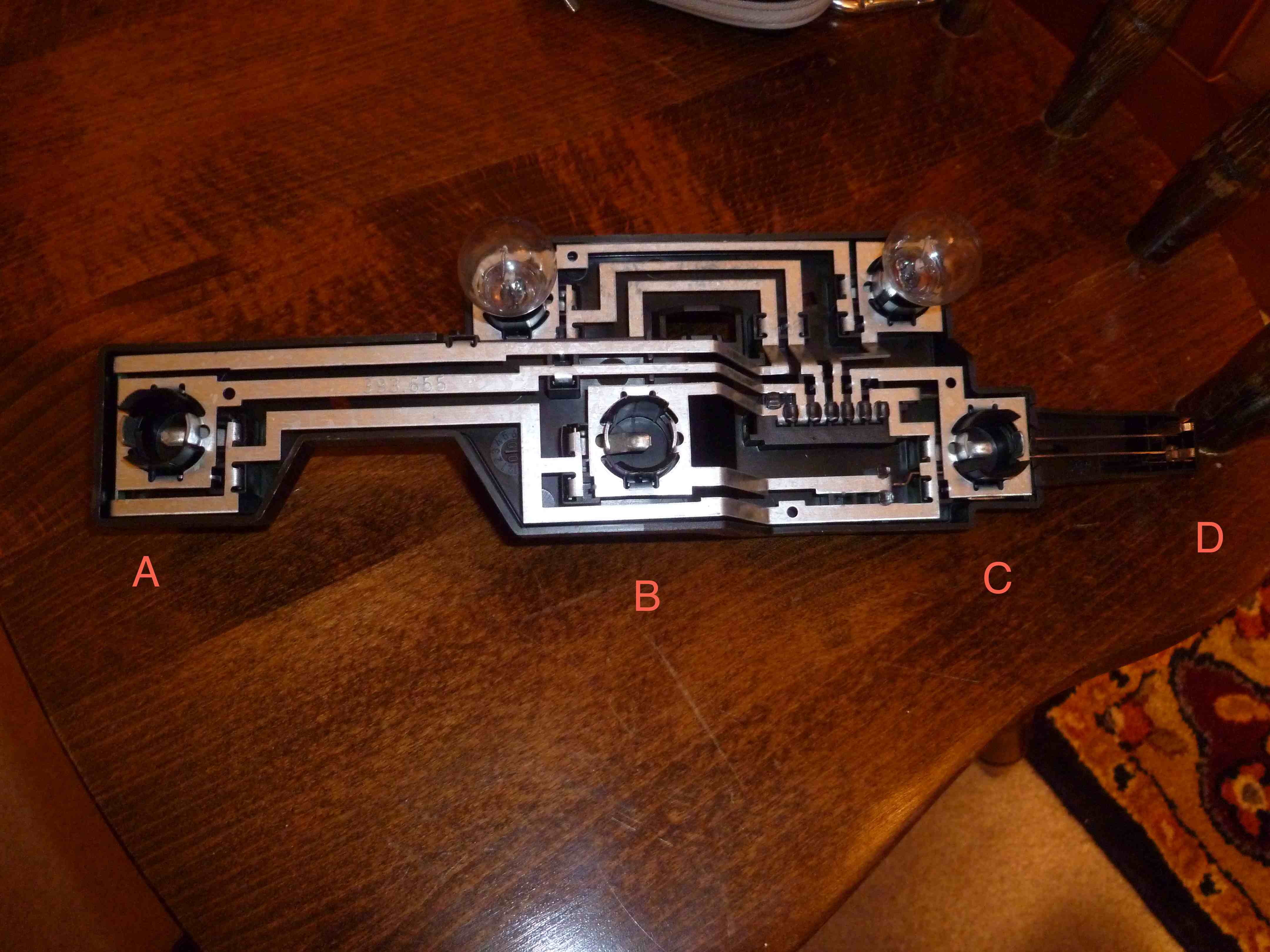 Position "A" lights the inner array and comes on _only_ with breaking. I also tested Position "C" the next down the line laterally - nothing, a dead socket for U.S. use, except as a fog light on the driver's side (only when fog lights on). Socket "D" is for a wedge bulb that cannot work with DEPO lights