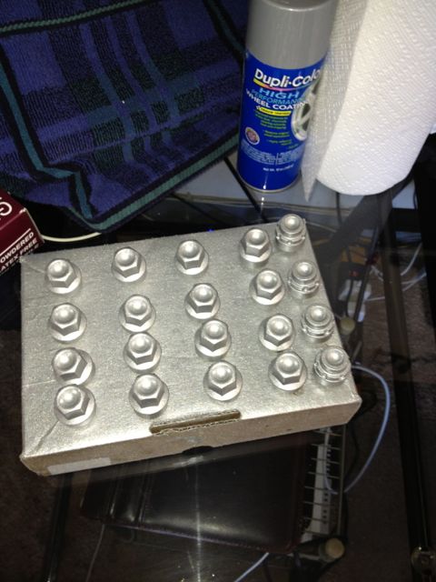 New rotors are on.:cool: I found out the brake pads I acquired did not have the hole in them for the brake pad sensors. Hawk HPS ferro carbon brake pads.. Enough fun for one day.. calipers paint next, ordered two new rear tires.. Attachment 16689Attachment 16690 Painted the lugs.. used an old packaging box..:) Attachment 16688 |