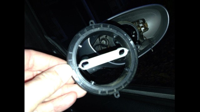 It looks like the ring has separated from adjusting motor. As best I can tell from the parts catalog picture, the ring is an integral part of the motor assembly. It's hard to know, but the diagram doesn't show the ring as a separate part. Perhaps it you can press fit it back on. To make it easier, you might remove the motor base from the mirror housing by removing the attachment screws. If you can't see how to press fit it, you might try gluing it back together with an epoxy. Before you do so, I'd suggest waiting to see what others say. |