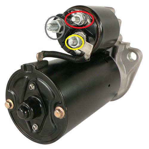 Just a thought. -EricThe yellow circle was the easy one." Yes... one of the wires (the one I had to massage on) is grounded to the top of the secondary air pump on the passenger side. The other wire... from where it originates I don't know... but it was clear it went to the larger post. It fit right on... and I had disconnected no other wires. "I haven't done this job on my car, but here's the Pelican article on it: https://www.pelicanparts.com/techarticles/Boxster_Tech/83-ELEC-Starter_Replacement/83-ELEC-Starter_Replacement.htm See pic 5. I had seen that pic... and it didn't help me at all. Thank you, both, for the input. I remain flummoxed. The yellow circle wire was a no-brainer. The red circle has the smaller diameter post... and that connection came from the left... the wire coming from the small loom with another wire connected to the part that snaps onto the electrical connection on the throttle body. The grey circle is where I connected the two heavy duty wires (one of wires took some massaging to get on the post). I don't even want to reconnect the battery. Perhaps I blew a fuse. However, I first have to identify if properly I reconnected the starter. It's not rocket surgery... and it appears the heavy duty wires went where they were supposed to go. I'm lost. Any other ideas? Thank you. Attachment 22291 Edit: OK. I see what you're saying, Eric. That wire from where I don't know it comes likely is from the battery... I'm thinking it comes fronm the square box with a positive wire goint to the altrnator. So I guess a new question is: Should that wire go to the red circle post? That would mean that there's two wires connected to that post. Should there only be one of the heavy duty wires... the ground wire coming from the top of the secondary air unit... connected to the larger post? Should there NOT be two wires connected to that larger post... and I was incorrect trying to put both heavy duty wires on that larger post? That would mean that I connected both a ground and positive wire together... and on the ground of the starter. Should there be two wires connected to the red circled post? Since I had no dash lights wafter the battery sparked... which fuse should I be looking at? Hmmm. I'll wait for a response from anyone. |
