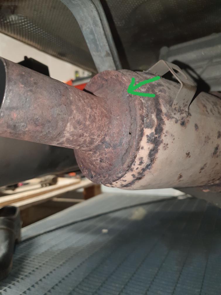 One of the final hurdles to get my car back on the road is the exhaust. For reference, I have build a G87.21 into the back of my 986 so the stock muffler doesn't fit. I got one of the 'sausage' shape at a local breaker and it does fit behind the gearbox. However, at least the right side exhaust pipe doesn't match up (not even nearly). The car has in its life taken a hit on that rear side, so I already noticed some dents in the pipe. More careful inspection today revealed that the catalytic converter is deformed significantly. The section where it goes from converter diameter back to the pipe diameter is forced inward, giving an odd shape and offset.