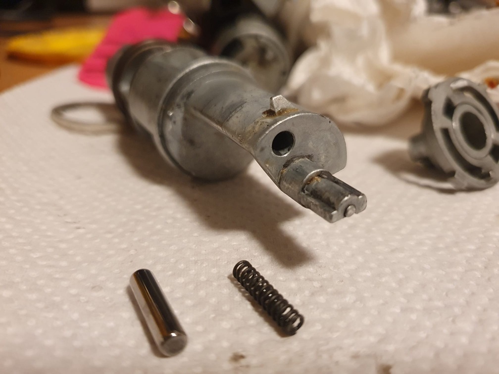 Attachment 23803 And the inside of the housing (showing the actual steering wheel lock deeper down with a spring etc.) Attachment 23802 From this I didn't find any loose or damaged parts. What I did find though was grease which has almost turned solid. That's not really nice. Also there is a little spring pin at the bottom of the assembly which I think is the main spring force to keep the key barrel connected. Attachment 23804 his pin and spring were also very very sticky. The pin did return, but slowly. So I took it out, cleaned the hole with brake cleaner and did the pin and spring as well. New grease on and re-inserted. I did the same on the other parts (the housing as far as I could as I didn't want to use brake cleaner on that with the wheel lock parts still in place). All new grease and then assembling it. So far I now can't replicate the endless turns anymore. The tricks I learned to get me into that mode no longer work. Besides that, the wheel lock pin now really snaps out when I remove the key. Previously it would slide out slowly. Overall I feel this could have solved my issue. I will get myself a new ignition switch as well as the old one does look a bit dodgy, but will keep the whole mechanism and try it out. |